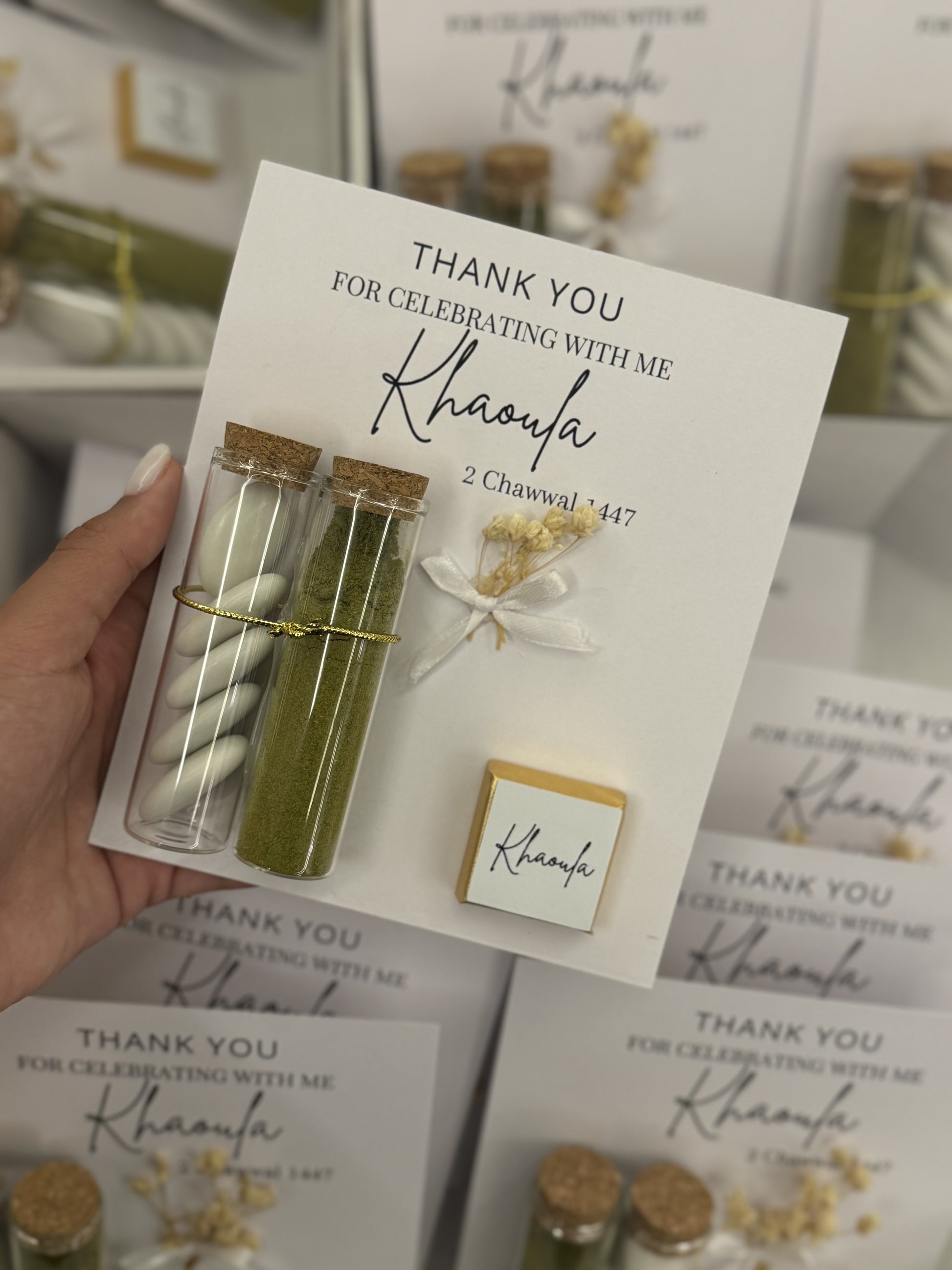 🌿 Deux fioles personnalisables (dragés chocolat, henné poudre, feuilles de henné, pétales de rose, serghina)