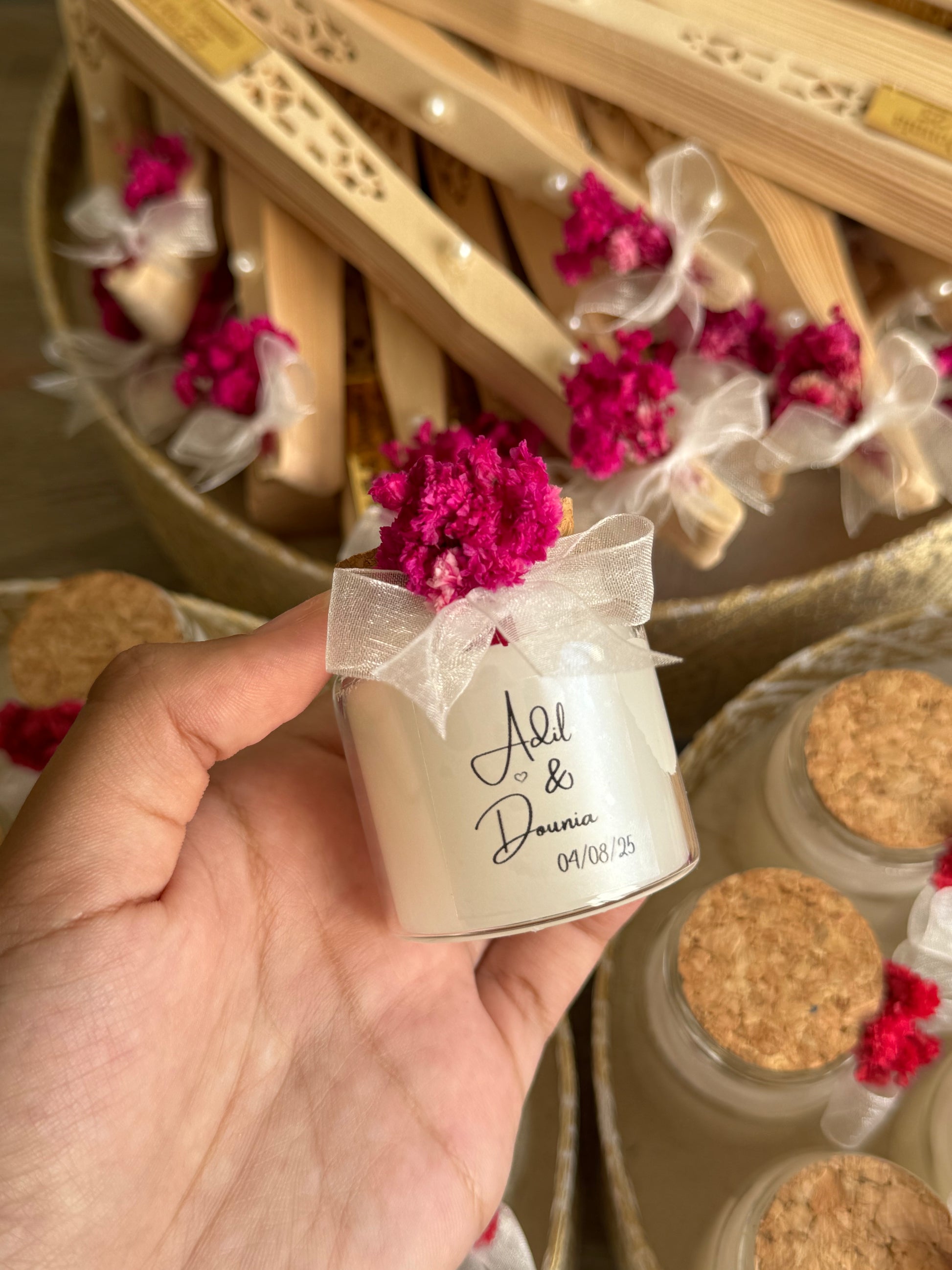 Chaque pièce est soigneusement décorée d’un ruban en organza, d’un sticker transparent personnalisable et d’une touche délicate de fleurs séchées, pour un rendu chic et intemporel.