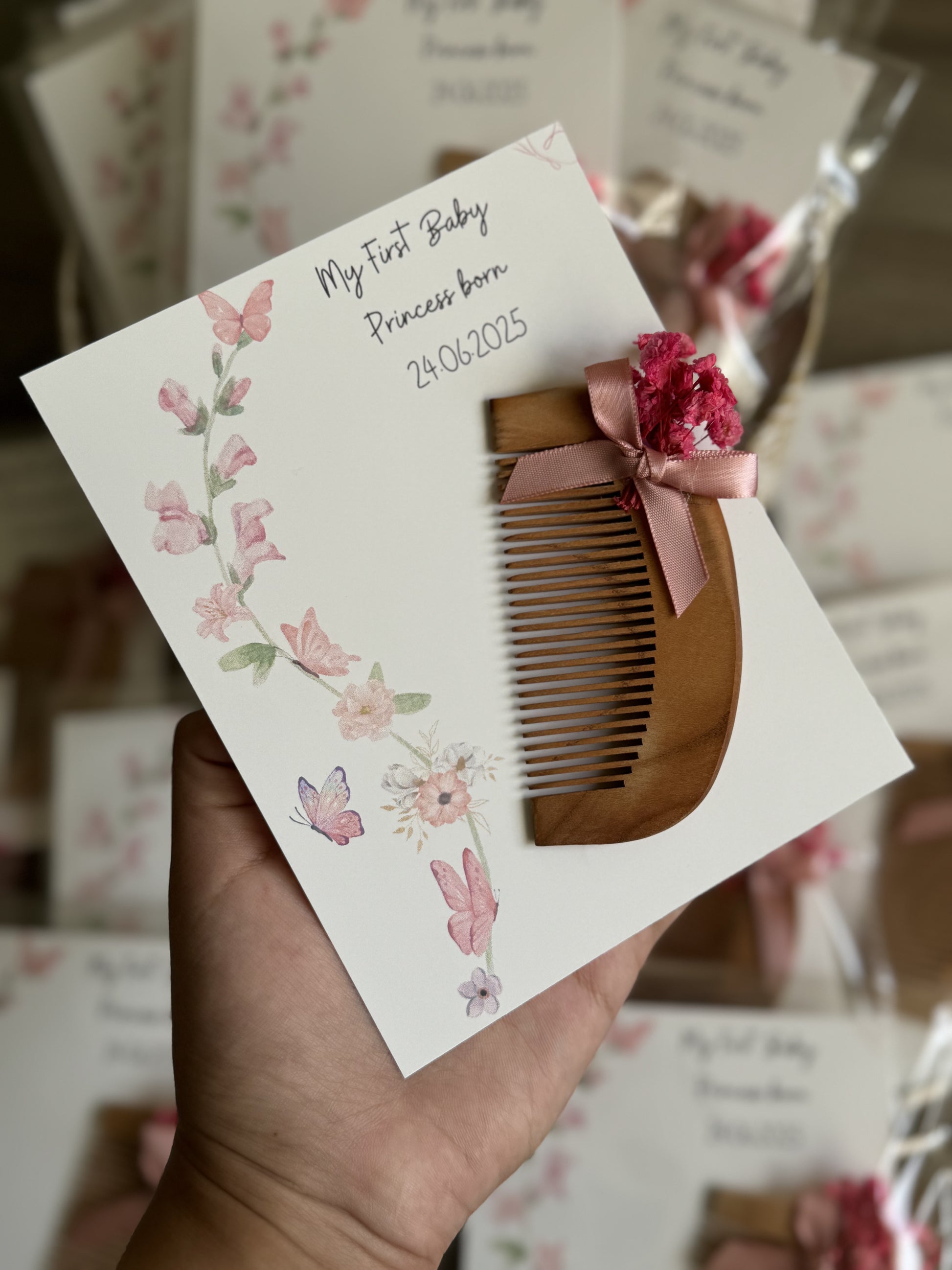Présenté dans une carte élégante, il met en valeur un peigne décoratif soigneusement travaillé, symbole de soin et de beauté, accompagné d’une personnalisation unique.