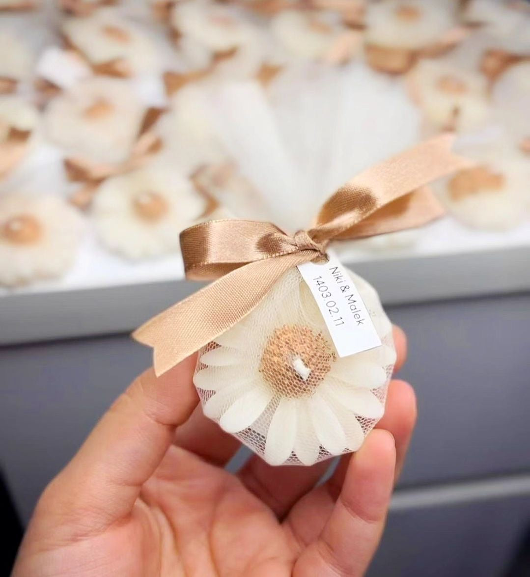La Fleur de Velours est un cadeau d’invité raffiné, présenté avec soin dans un élégant tulle orné d’un ruban délicat.