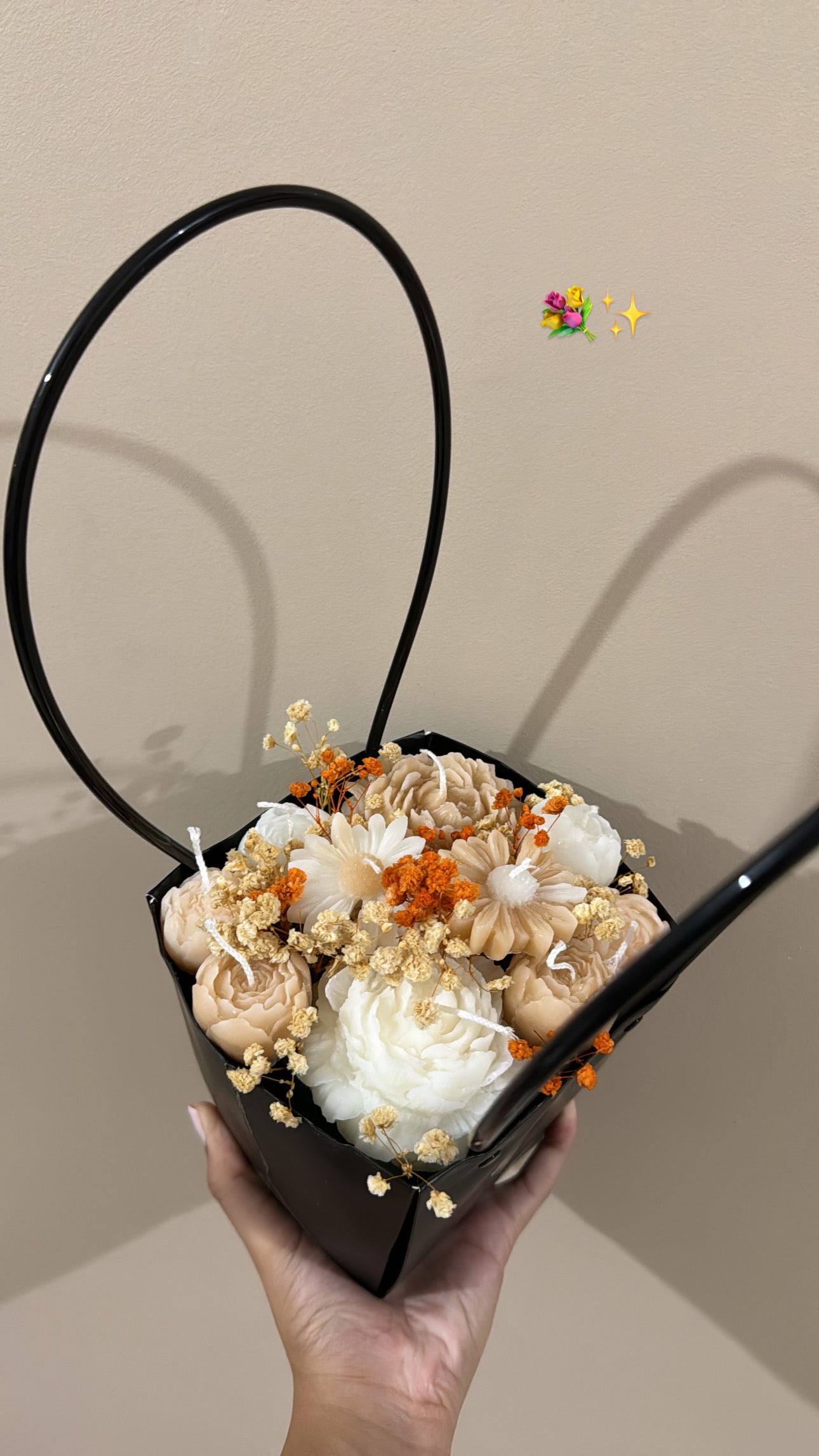 Un panier floral raffiné, garni de bougies parfumées en forme de fleurs 🌸.
