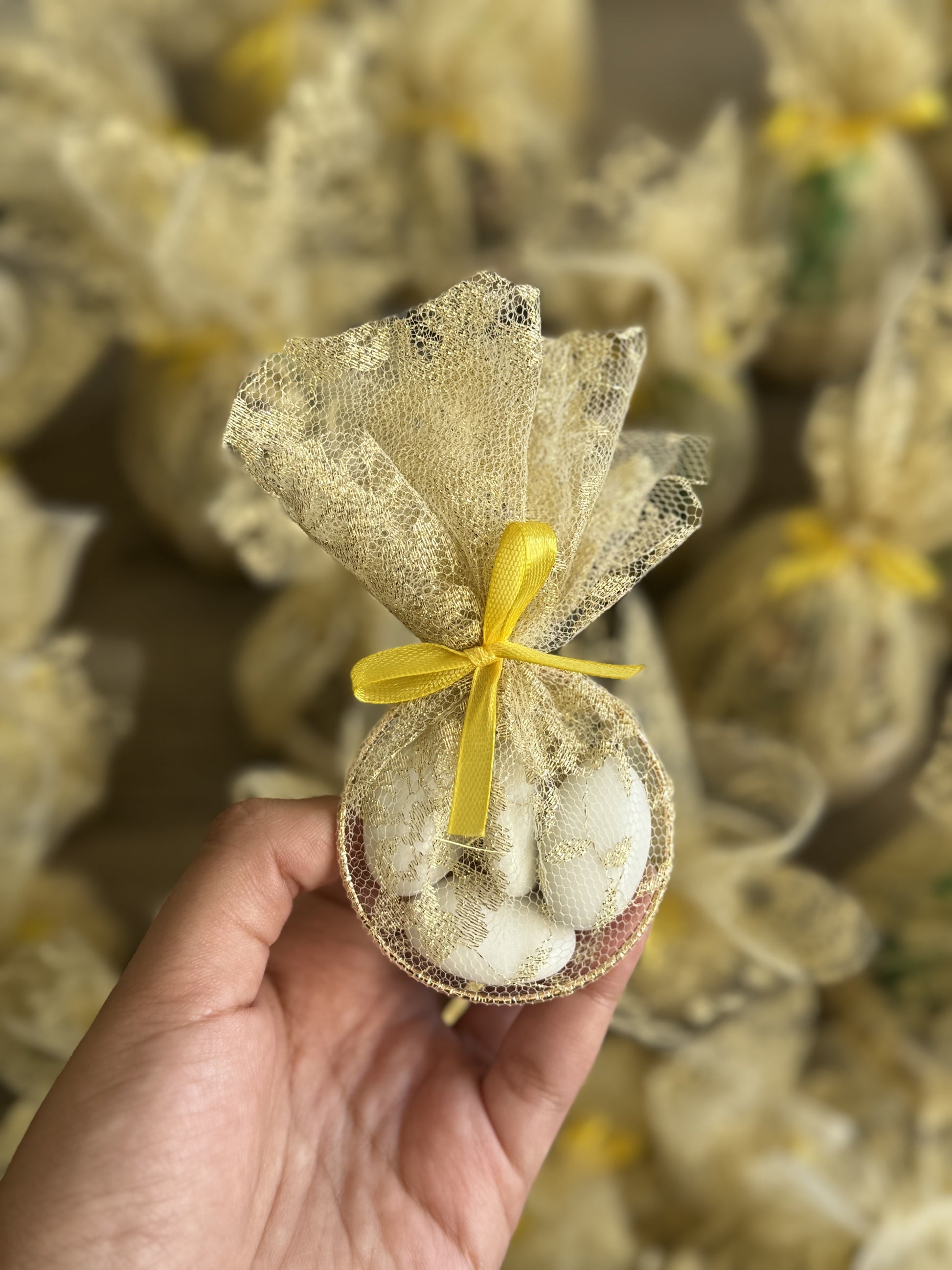 Un classique revisité avec élégance : le Trésor d’Organza est une délicate pochette en tissu organza, garnie de dragées soigneusement sélectionnées. Avec son ruban raffiné et sa transparence subtile, elle apporte une touche de douceur et de chic à vos événements. Idéale pour remercier vos invités lors des mariages, fiançailles, naissances ou Henna Day.